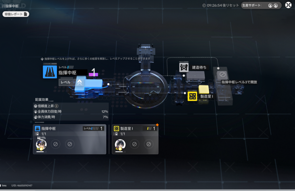 まあそんなことはさておき、とりあえずチュートリアルでもある行動レベル15と帝江号の中がいじれるところまで行きました。この辺のシステムはロドスでも同じですね。多分育成や金のところで有利なので早めに整備したい部分ではあります。